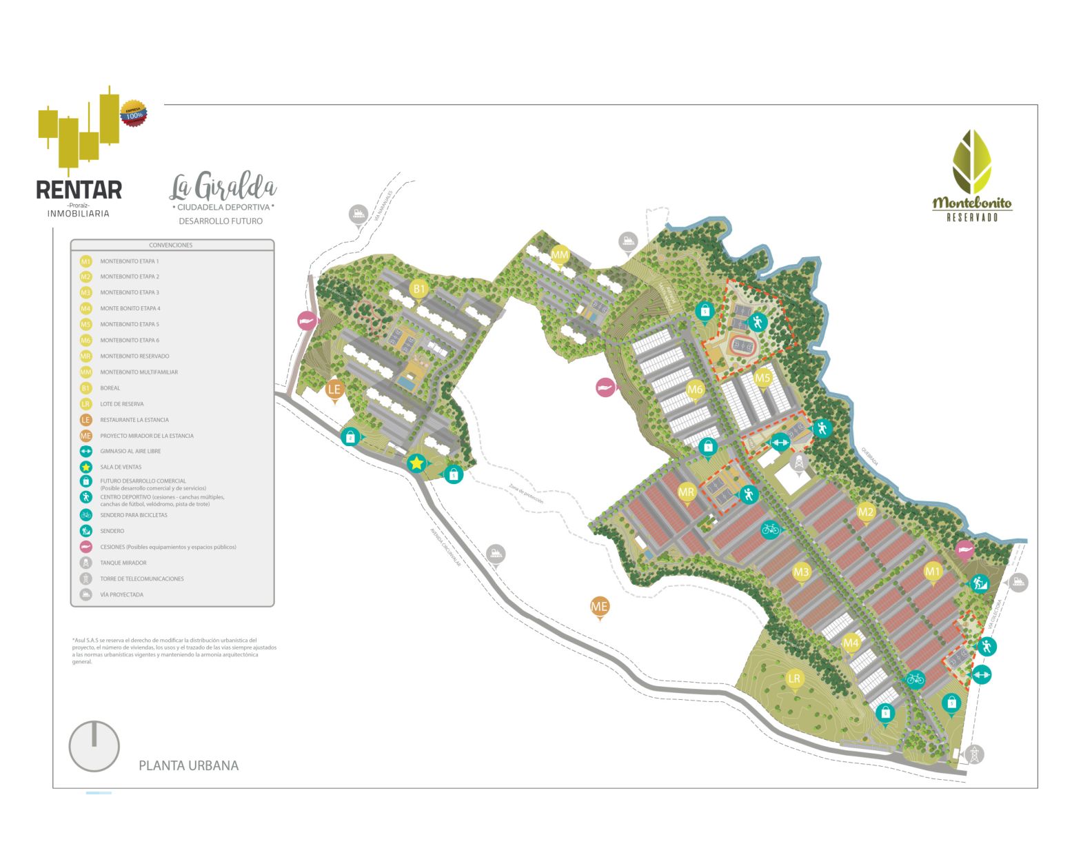 Montebonito Reservado es parte del macroproyecto La Giralda - Ciudadela Deportiva en Dosquebradas. Este conjunto residencial de 200 viviendas está diseñado para el bienestar familiar, integrando un entorno deportivo y comercial. Ofrece una amplia gama de zonas sociales que incluyen piscinas para adultos y niños, gimnasio, pista de triciclos, senderos y zonas verdes, todo ubicado estratégicamente a solo 5 minutos del Viaducto César Gaviria Trujillo.